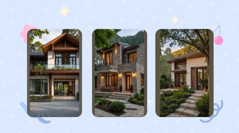 And can we talk about that massive tree? It’s not just for shade; it’s basically the house’s personal, giant, leafy umbrella, probably whispering secrets to the roof tiles when no one’s around. The whole entrance, with those charming steps and glowing lanterns, looks like it’s inviting you to a super cozy hangout session, maybe with a smoothie and a good book on that comfy little chair. This isn’t just a house; it’s a personality, a truly unique house design that’s ready for movie nights, secret conversations, or just chilling out without feeling like you’re stuck in a cookie-cutter neighborhood.