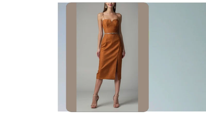 This rust-colored dress is the perfect blend of romantic fashion and ready-for-anything style. Imagine strolling along a beach at sunset, the golden light catching the shimmer of that sparkly belt – totally swoon-worthy! It’s the kind of outfit that makes you feel confident and classy, without needing a tiara or a knight in shining armor. Plus, that little side slit? It’s the subtle touch of sass that says, “I’m fabulous, and I know it.”