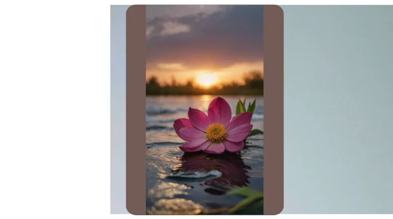 This picture is like a postcard from a super chill place! Imagine this: the sun’s going down, painting the sky in all sorts of amazing colors, and a pretty pink flower is just floating on calm water. It’s the kind of scene that makes you want to just breathe deeply and forget all your worries— total peace and quiet! It’s like the flower is having its own little spa day, enjoying the sunset and the peaceful nature all by itself.