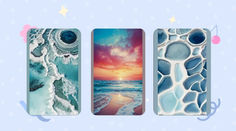 Looking at this wallpaper, it’s like someone took a bunch of vacation photos from a super fancy beach and then just…shoved them all together! There’s so much blue, it’s basically a coastal explosion, like if the ocean and sky had a baby, and that baby decided to decorate. I almost expect to see a tiny surfboard sticking out somewhere, or maybe a mermaid waving from behind a particularly large wave.