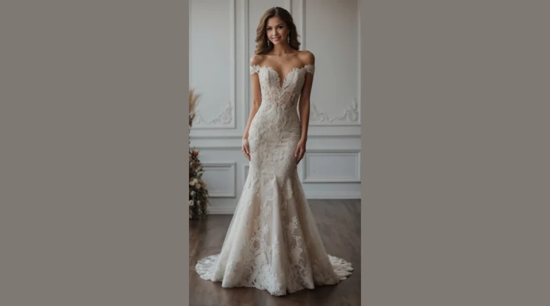 Moving around in this dream dress might make you feel like you’re floating, or maybe doing a secret mermaid shuffle down the aisle! The off-the-shoulder design is super elegant and totally boho-chic, perfect for showing off those killer collarbones. Plus, with all that beautiful sparkly lace, every step will feel like you’re leaving a trail of pixie dust, or maybe just making sure everyone knows you’re the main character. It’s the kind of dress that says, “Yes, I’m getting married, and yes, I’m fabulous, so clear the dance floor, because this mermaid can groove!”
