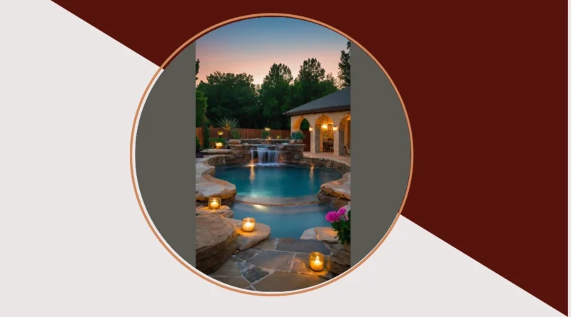This isn’t your average backyard splash zone! Imagine this: the sun’s dipping below the horizon, painting the sky in gorgeous sunset hues, while you’re chilling by a stunning pool that looks like it belongs in a magazine. This pool landscaping is seriously next level—it’s got a waterfall cascading into a gorgeous pool, surrounded by comfy-looking rocks, and twinkling candlelight that sets the perfect mood. It’s like your own personal oasis, ready for epic pool parties or quiet evenings under the stars. Forget boring old pools – this is a total upgrade!