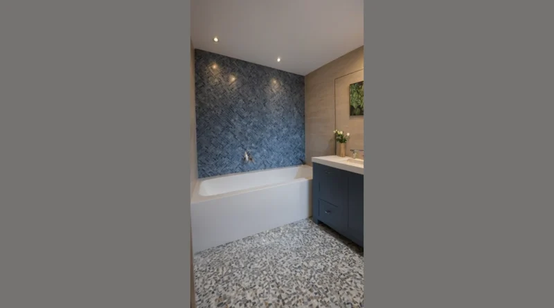 Then there’s the bathtub, looking all inviting and ready for some serious relaxation. That cool blue tiled niche in the wall isn’t just for show; it’s the perfect spot for your favorite bath bomb or even a waterproof speaker for your playlist. With all those huge windows, you get a ton of natural light, making the whole room feel super open and chill. It’s the kind of bathroom remodel that makes even mundane tasks like washing your face feel a little bit luxurious. Who knew a bathroom could be this cool? It’s almost too good to mess up with toothpaste!