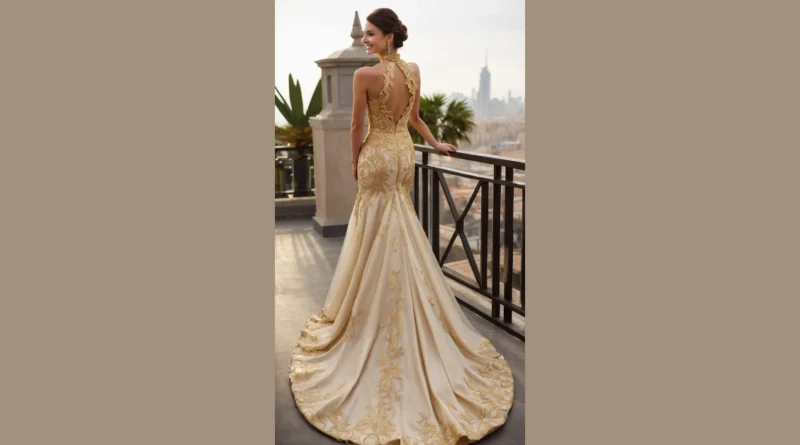 Seriously, who needs a tiara when you’ve got this? The high neckline is super chic, and the whole dress just flows so beautifully. You’d feel like a million bucks (or maybe a million gold pieces!), and you’d probably leave everyone speechless. Plus, think of all the amazing Instagram pictures you could get! This gold wedding dress is the perfect blend of elegance and fun—the kind of dress that’s both unforgettable and totally you.