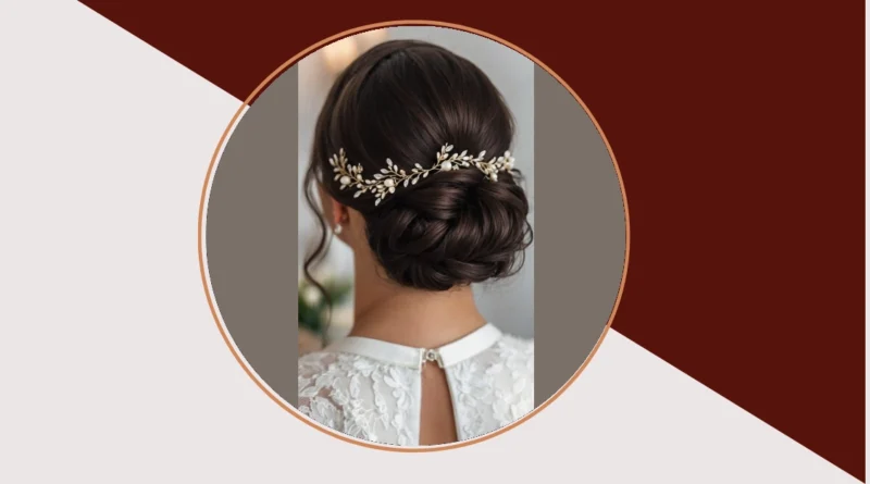 This hairstyle is seriously next level! Imagine you’re getting ready for your big day, and BAM! Your hair looks like a million bucks, but in the best possible way, not like you’re trying too hard. It’s like a fancy, elegant bun that went to hair school and graduated top of its class. That delicate sparkly headband? Pure perfection! It’s the kind of hairstyle that makes you feel like a princess, but also totally yourself, which is way more important.