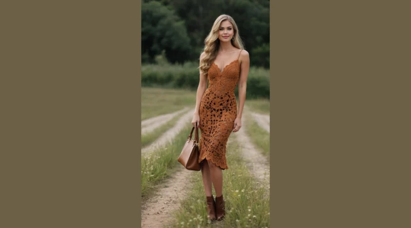 Forget boring clothes; this crochet-inspired number is here to prove that yarn can be seriously chic! It’s like someone took all the cool patterns from your grandma’s best throw blanket, gave them a glow-up, and turned them into a stunning, form-fitting dress. You just know this outfit isn’t something you’d find just anywhere – it practically screams “I woke up like this and decided to look fabulous while walking down a dirt path, because why not?” Plus, that rich, earthy color is totally vibing with the whole outdoorsy scene.
