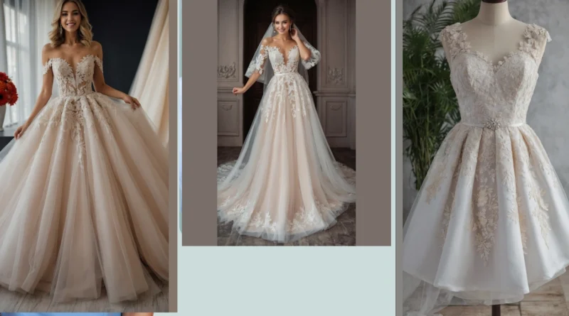 Who said wedding dresses have to be blindingly white? This fabulous gown is here to prove that a little color makes everything more exciting! Look at this dress, shimmering in a gorgeous soft champagne or blush hue – it’s like a secret glow-up for your big day. With its stunning lace details and a skirt so poofy you could probably hide a small pony under there (just kidding, mostly!), it definitely knows how to make an entrance. It’s the perfect way to add a unique, “that’s so me!” touch to what’s usually a very traditional outfit, proving that breaking the rules can look absolutely amazing.