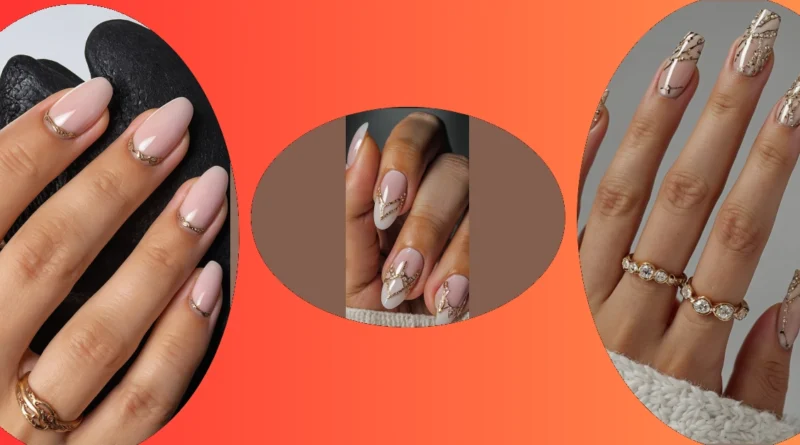 You know classic french tip nails with that clean white line at the end? Well, these nails decided to flip the script and throw a fancy party down at the cuticle instead! They’re rocking a totally chic nude-pink base, but instead of a simple tip, they’ve got this cool, delicate gold detail hanging out near the bottom. It’s like your nails are wearing tiny, elegant golden headbands or maybe even little crowns. They look super polished but still have a fun sparkle that isn’t trying too hard – perfect for pretending you’re famous or just feeling extra fancy on a Tuesday.
