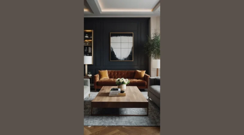 This living room is giving serious “adulting” vibes, but in the best way possible! Imagine having your friends over for a movie night – that comfy brown sofa practically begs for a cozy blanket and some popcorn. The dark walls and gold accents are super sophisticated, and it’s like something straight out of a design magazine. It’s not your grandma’s living room – it’s got that cool, contemporary feel without being too over-the-top or fussy. Who needs neon colors and crazy patterns when you’ve got this kind of understated elegance?