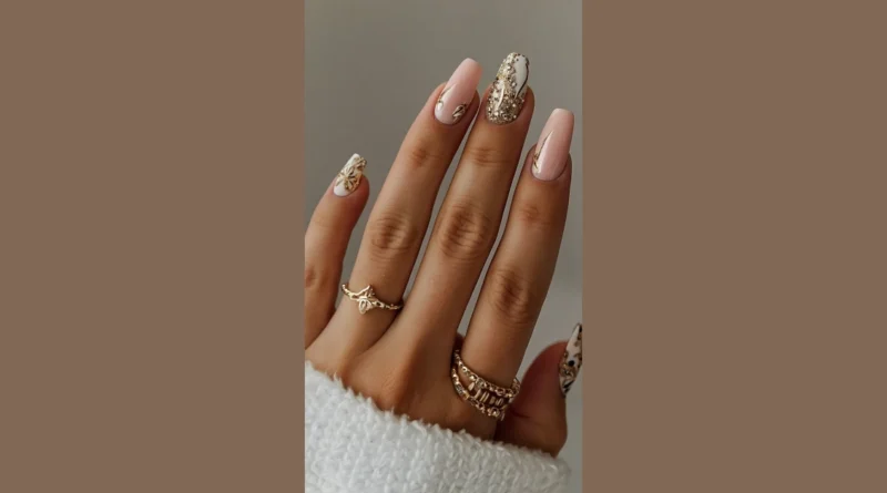 And check out those rings! They’re the perfect accessories to complete the look. It’s like the nails and rings are having their own little winter wonderland party! Between the sparkly gold, the pretty pink, and those delicate rings, your hands are ready for all the holiday selfies and present-opening you can handle.