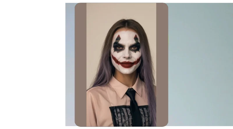 This image is all about the classic Joker costume, but with a unique twist! The makeup is perfectly on point, with the white face paint and red lips. But what’s really awesome is the outfit! It’s not your typical crazy Joker attire. Instead, she’s rocking a classy pink button-down shirt and a black tie, which gives the whole look a super cool and unexpected vibe. It’s like she’s ready to hit up a fancy gala, but she’s also got that mischievous Joker spirit. So if you’re looking for a Joker costume that’s both stylish and spooky, this one is definitely worth checking out!