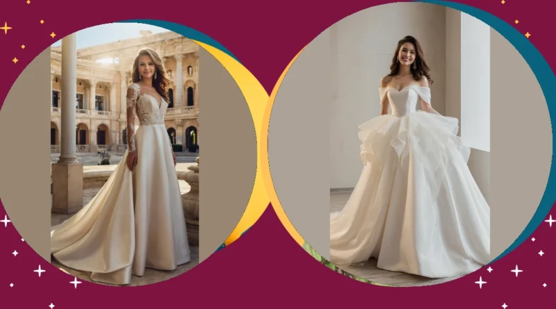 Wow, check out these gorgeous wedding dresses! They’re like something out of a fairytale – all sparkly lace and flowing tulle. Imagine yourself twirling around in one of these, feeling like a total princess. That long sleeve detail on the main dress adds a touch of elegance; it’s like a super fancy, bridal superhero cape! The other dress is pretty amazing too, showcasing that off-the-shoulder look is still totally in! These dresses are the perfect blend of classic and modern, making them seriously dreamy choices for any bride-to-be.